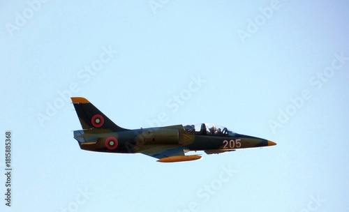 Aero L-39ZA "Albatros" jet in camouflage colors, tail number 205, Bulgarian Air Force, flying above Dolna Mitropoliya airbase runway
