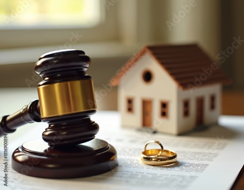 Gavel rests on divorce papers near wedding rings and miniature house. Legal separation of marital assets like property and home is settled in court.