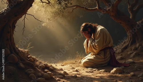 Jesus kneels in garden praying under olive tree before arrest. His face hidden, he expresses deep sorrow. Light rays illuminate scene of divine struggle and impending sacrifice.