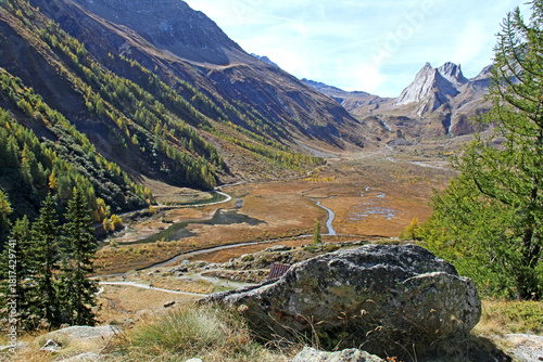 la piana di Combal (un tempo lago) e le Piramidi Calcaree; Val Veny, Valle d'Aosta