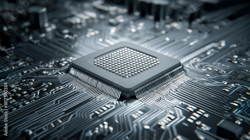 Close-up of a computer CPU chip with blank surface highlighting modern electronic and digital technology, microprocessor design, and futuristic computing concept perfect for tech visuals