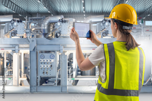 Industrial equipment inspector reviews machinery performance using a digital tablet, checking system schematics and verifying operational parameters in a modern production facility.