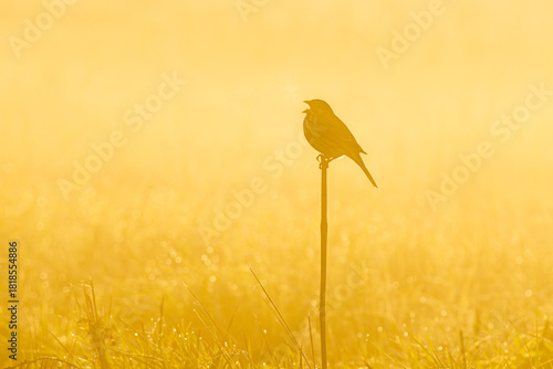 Potrzeszcz śpiewający na gałązce o wschodzie słońca w gęstej mgle na łące, złota godzina
