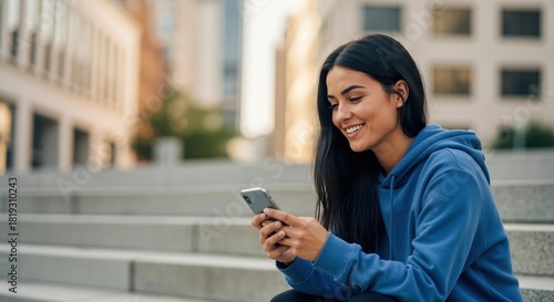 Happy young woman using smartphone sitting on urban steps. Smiling female student texting outdoors in city