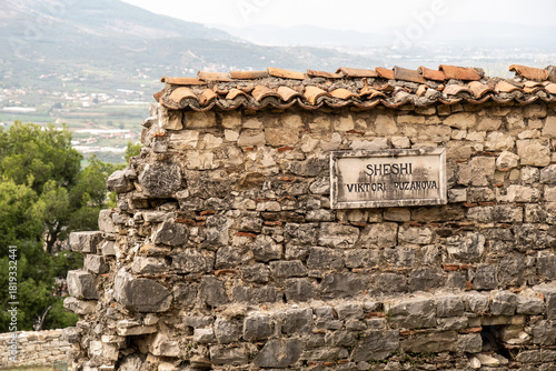 Historische Steinmauer mit Straßenschild Sheshi Viktori Puzanova, Berat, Bezirk Berat, Albanien