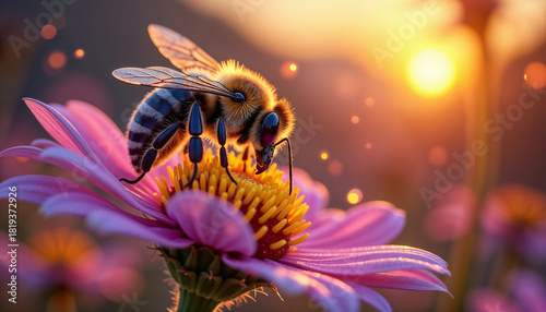 Honey bee rests on flower, collecting pollen in warm light. This honey bee forages on blossom, its body dusted with pollen. Scene honey bee gathering nectar symbolizes summer's bounty.