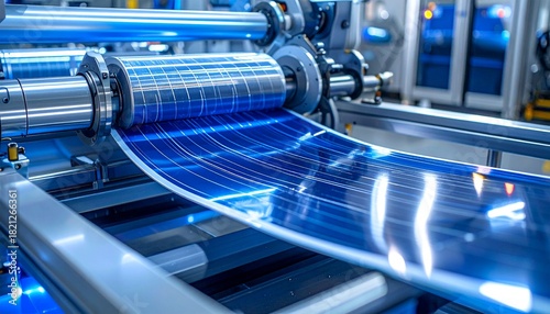 青く輝くペロブスカイト太陽電池シートが製造ラインのローラーで送り出される
