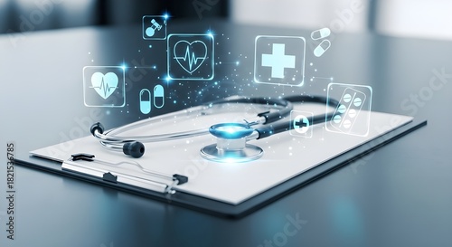 Primer plano de un estetoscopio y una tableta digital con registro médico electrónico virtual del paciente en la interfaz. Atención médica digital y red en una pantalla virtual moderna, tecnología méd
