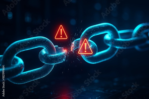 Glowing digital chain link breaking apart with red warning symbols, concept of cybersecurity breach and network vulnerability