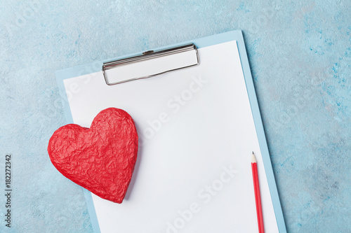 Medicine clipboard and red shape of heart on blue background top view. Healthy and cardiology concept. Copy space for text.