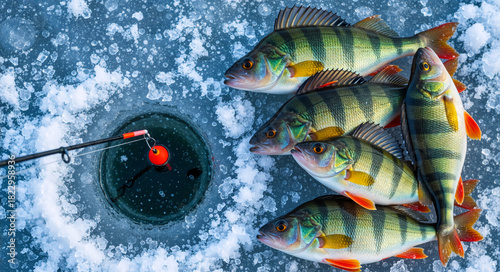 A successful ice fishing catch of perch on a frozen lake. Fresh fish lying on the snow next to a fishing rod and an ice hole. Winter outdoor recreation and hobby concept