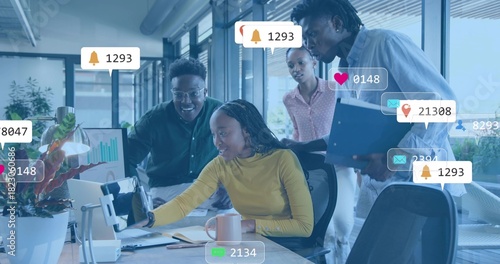 Reaching seated woman in mustard top touching phone at office desk, showing notification icons