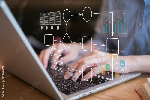 Professional entrepreneur businessman workflow process project management planning strategy system data analysis marketing flowchart algorithm laptop business concept