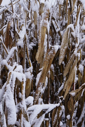 Zbliżenie na kukurydzę w śniegu na polu. Śnieżna pokrywa osiada na kolbach i liściach, tworząc zimowy, minimalistyczny kontrast między bielą a złotem roślin.