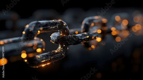 Photorealistic modern blockchain as a high-tech gold chain on black. Concept: Blockchain technology, data security, fintech, digital storage, cybersecurity, secure information storage