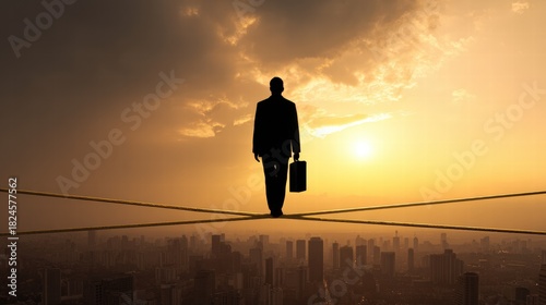 Businessman Walking on a Tightrope High Above a City Skyline at Sunset
