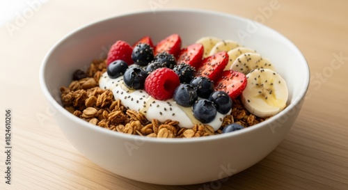 Nutritious morning breakfast bowl with crunchy granola, fresh mixed berries including strawberries and blueberries, topped with creamy yogurt served on wooden table - healthy eating and wellness