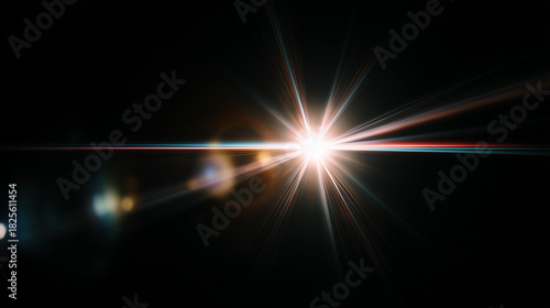 Strong cinematic lens flare effect with colorful glow and radial brightness on pure black background. Abstract optical light overlay for photography compositing