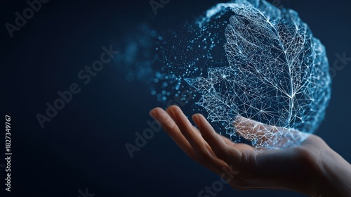 A hand cradles a digitally rendered leaf, a stunning visual metaphor for the interconnectedness of nature and technology. ..Created with Generative AI, not depicting real subjects.