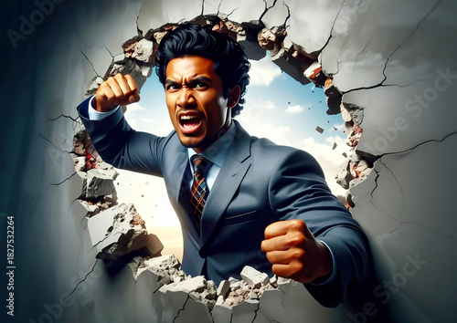 壁を打ち破るビジネスマンの挑戦と成功のコンセプトの3dイラスト