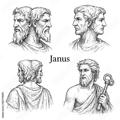 Roman god Janus with double-faced figure and classical poses in vintage engraving style, Transparent Background