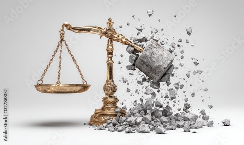 A vintage gold scale being destroyed by a falling, heavy grey rock