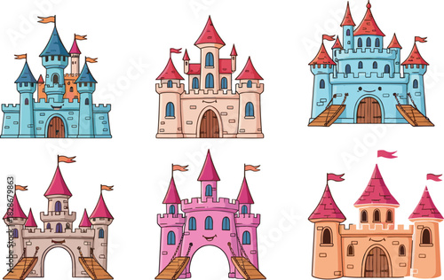 Cartoon castles vector illustration, fantasy architecture design, colorful towers and flags, magical theme, kids content, whimsical clipart, fairy tale buildings, enchanted style