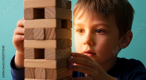 a young boy carefully focuses on a precarious wooden tower attentively considering his next move while playing the popular game of jenga high quality professional detailed