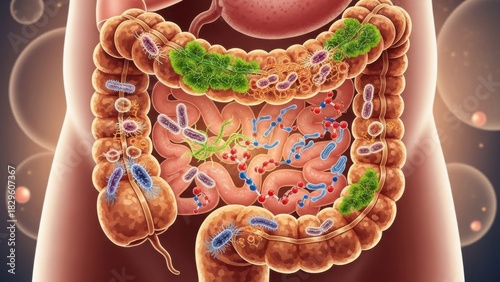 Artistic representation of the human digestive system with microbiome and microorganisms focus