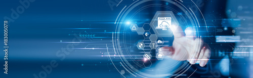 Businessman touching the web hosting and server solutions, cloud storage, domain tools, website performance, secure networks, digital uptime