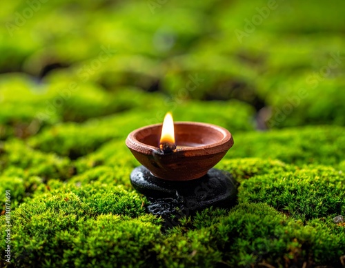 Serene traditional clay lamp radiating warm light upon vibrant moss in tranquil natural setting