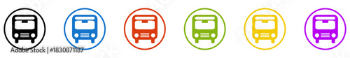 Banner mit 6 farbigen Icons im Kreis: Reisebus, Haltestelle oder Bus