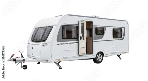 Pristine, modern white travel trailer caravan with an inviting ajar entrance door and soft light curtains, against a seamless transparent studio background. Concept for nomadic lifestyle and freedom