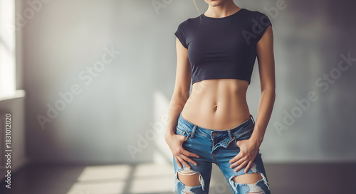 Fit and Confident Woman in Jeans Showcasing Toned Abs Indoor Studio Fitness Goal Achieving Healthy Lifestyle Female Empowerment Beautiful Physique Sportive Bodycare Posture