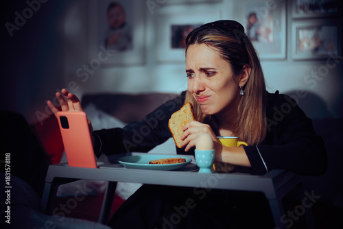 Anxious Woman Checking her Phone While Having Breakfast in Bed. Lady doom eating while scrolling not focusing enough on her meal