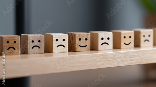 An emotional evaluation concept illustrated with wooden blocks showing varying facial expressions representing sentiment analysis decision making and human centered assessment.