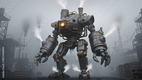Steam-powered mech suit standing in a foggy industrial yard.