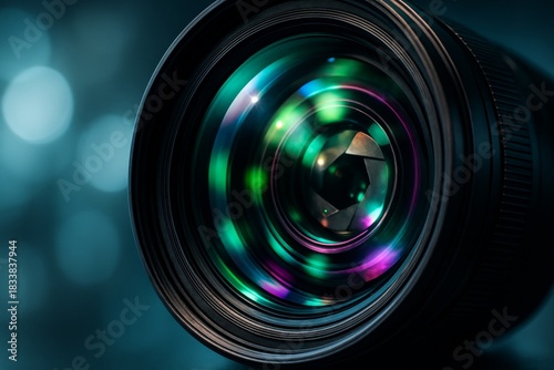 Close-up of colorful camera lens with reflections and aperture blades in focus, symbolizing vision, creativity, and photography concept. Ai generative