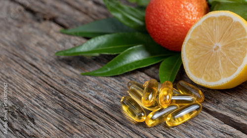 Top-down view of vitamin C capsules and fresh citrus fruits on a rustic wooden surface, bright sunlight accentuating vivid orange and yellow hues, symbolizing nutrition and wellnes