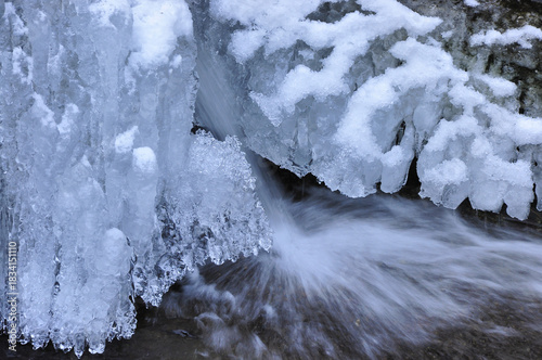 Rezerwat przyrody "Wąwóz Myśliborski" w zimowej scenerii. Zimowe formacje lodowe wzdłuż ośnieżonego brzegu rzeki z soplami i płynącą wodą.