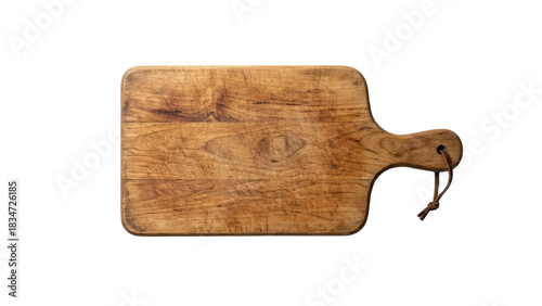 Rustic antique wooden cutting board with handle for kitchen food preparation isolated on transparent background