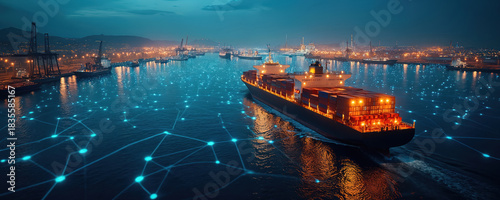 Illustration of busy port at night. Container ship sails in harbor surrounded by digital network. Global trade routes transport goods. City lights sparkle in background. Modern logistic concept.