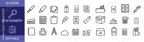 Stationery Icons Grid. Outline icon set of stationery in bookshops: notebook, pen