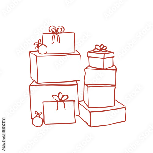 Hand drawn trendy vector composition of gift boxes and christmas decorations in whimsical style on white background