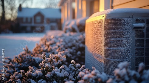 frost-covered air conditioner unit next to house wall with snow-covered shrubs and houses in background during golden hour winter morning