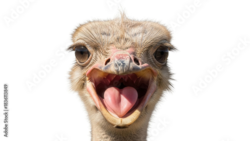 Ostrich head with open beak isolated PNG on transparent background, funny bird portrait with expressive face for wildlife concepts