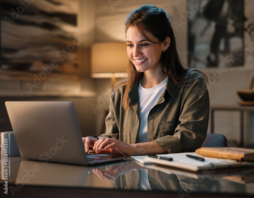 Młoda, uśmiechnięta, studentka bierze udział w zajęciach online pisząc na klawiaturze laptopa