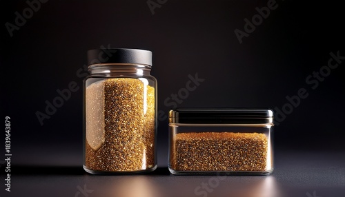 two black rectangular containers one beside a clear glass jar filled with golden toned small pellets sit on a dark background