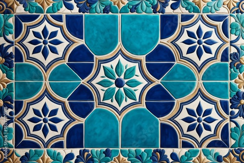 Ornate geometric pattern with blue and turquoise tiles. Traditional arabic or moroccan design for backdrop and decoration.