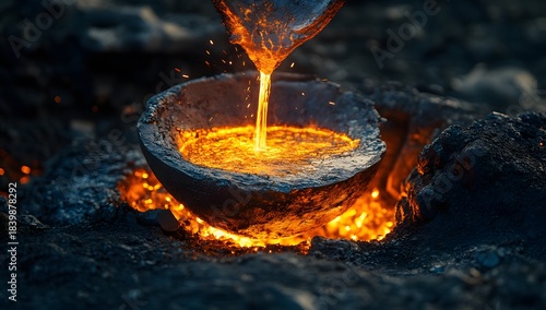 A glowing stream of liquid gold being carefully poured into a hot metal crucible